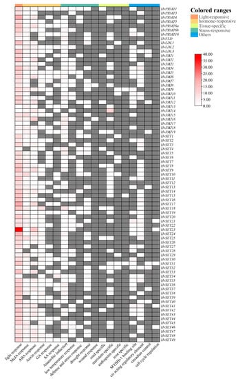 Analysis of promoter cis-acting elements of HvHMTs and HvHDMs. Gray squares indicates that the number of cis-acting elements in the gene is zero.