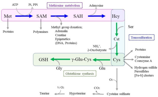 - Pajares, M.A.; Pérez-Sala, D. Mammalian Sulfur Amino Acid Metabolism: A Nexus Between Redox Regulation, Nutrition, Epigenetics, and Detoxification. Met transsulfuration. Antioxid. Redox Signal. 2018, 29, 408–452. [Google Scholar] [CrossRef] [PubMed]