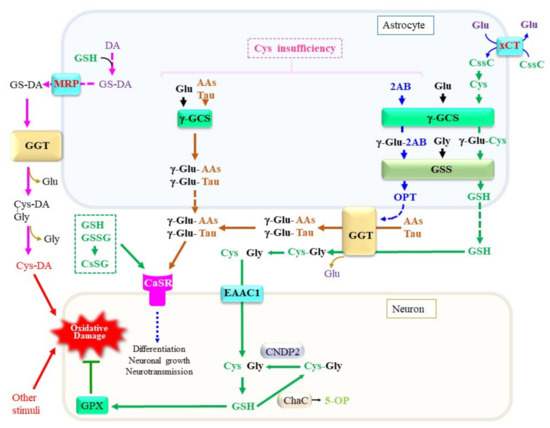 Fujii, J.; Osaki, T.; Soma, Y.; Matsuda, Y. Critical Roles of the Cysteine–Glutathione Axis in the Production of γ-Glutamyl Peptides in the Nervous System. Int. J. Mol. Sci. 2023, 24, 8044. https://doi.org/10.3390/ijms24098044