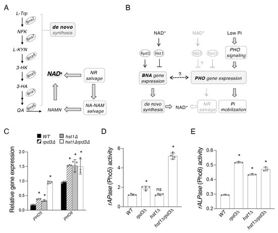 In this study, we aim to study how de novo NAD+ metabolism is connected to PHO signaling with a particular focus on Pho2, PNC1, and two histone deacetylases (HDACs), Hst1 (NAD+-dependent) and Rpd3. In previous work, we identified the histone deacetylase Rpd3 as a positive regulator of de novo NAD+ metabolism, which acts specifically by antagonizing the Hst1-dependent repression of the BNA genes (Figure 1B) []. Rpd3 and Hst1 also appear to co-regulate many other additional NAD+ metabolic factors either antagonistically or synergistically [], which suggests these two HDACs might coordinate de novo NAD+ metabolism with other branches of the NAD+ metabolic network or with other signaling pathways in the cell. Our previous study showed that the expression of several PHO genes is increased in hst1Δ mutant cells [], suggesting a direct role of Hst1 in the repression of PHO genes in an NAD+-dependent manner. Rpd3 appears to also repress the PHO pathway [,,], which is opposite to its role as a positive regulator for BNA gene expression [] (Figure 1B). The interaction of Hst1 and Rpd3 on the regulation of PHO genes is currently unclear. Here, we present evidence that Hst1, Rpd3, and the transcription factor Pho2 link the regulation of the BNA genes with PHO signaling and with NR and NA-NAM salvage, in which a novel role for Pho2 as a regulator of PNC1 is also identified. This work contributes to the elucidation of NAD+ metabolism, its regulation, and its relationship with other metabolic pathways in the cell.