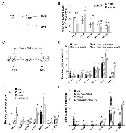 To further understand the mechanisms of the interconnections between de novo NAD+ metabolism and the PHO pathway, we first sought to determine the effect of Pi depletion on BNA expression. However, this question is difficult to address directly. Given that Pi depletion decreases cellular ATP levels [], while ATP depletion itself leads to NAD+ depletion [], we would expect extended Pi-depletion to cause a corresponding drop in NAD+ levels. This would have the ultimate indirect consequence of limiting NAD+-dependent Hst1 activity and inducing BNA expression (Figure 2A), as Hst1 is a critical negative regulator of BNA expression [,]. Owing to these considerations, we attempted to identify a time window that would preserve the cellular NAD+ pool while also sufficiently inducing PHO signaling. We found that, soon after transfer to Pi-depleted (low-Pi) medium, cellular NAD+ levels significantly dropped (Figure 2B). Interestingly, one of the first evident changes upon Pi depletion was a redox imbalance between NADH/NAD+ (~5 min), with the ratio quickly rising and then leveling out over time. Since NAD+ depletion appears to be an inevitable confounding factor of Pi limitation, we employed the hst1Δ mutant in our studies of Pi depletion, which is not expected to be sensitive to changes in NAD+ levels with respect to the regulation of BNA expression. As shown in Figure 2D, the expression of most BNA genes was slightly but significantly reduced by Pi-depletion in hst1Δ cells, with the exception of BNA6. Expression of PHO5 was included as a positive control of PHO activation. It is possible that BNA6 expression is less sensitive to Pi depletion and that this effect is only visible under more derepressed conditions. To further investigate whether BNA6 expression is indeed insensitive to Pi depletion, we sought to further increase BNA expression. It has been shown that the ade16Δade17Δ mutants, which are genetic mimics of adenine depletion, also have increased BNA expression through a mechanism in parallel to Hst1 (Figure 2C, left) []. In these cells, activation of BNA expression is mediated by a specific transcription complex Bas1–Pho2, which is stimulated by an adenine intermediate (5′-phosphoribosyl-5-amino-4-imidazole carboxamide monophosphate, ZMP) that it accumulates []. Although the primary function of Bas1–Pho2 complex is to activate genes for de novo adenine synthesis, it also activates BNA genes during adenine depletion or when cells accumulate ZMP metabolites []. Therefore, we also deleted ADE16 and ADE17 in the hst1Δ background in order to further induce BNA expression by this ZMP-Bas1–Pho2-dependent mechanism. Interestingly, expression of BNA2 and BNA6 was further increased in the hst1Δade16Δade17Δ triple mutant compared to the hst1Δ mutant (Figure 2D). In addition, in this background, we were able to observe that all BNA genes are sensitive to Pi-limitation, which reduces BNA gene expression and a concomitant increase in PHO5 expression. These results also demonstrate an inverse correlation between BNA and PHO gene expression during Pi-limitation (Figure 2D).