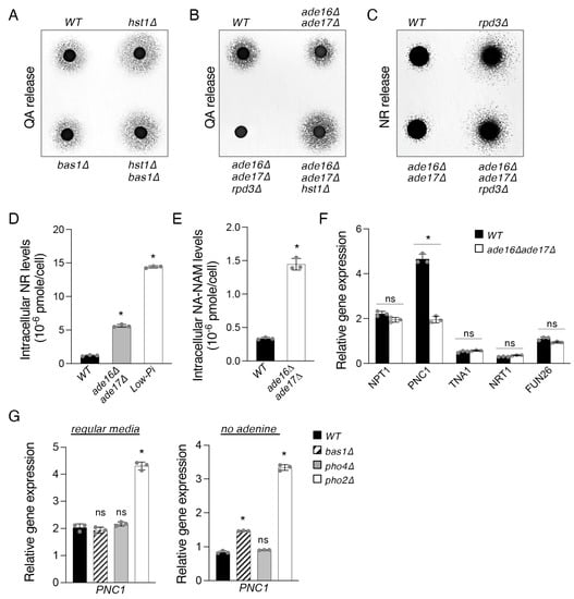The ade16Δade17Δ mutant cells show altered homeostasis of NAD+ precursors. (A) Deletion of BAS1 does not markedly affect QA release in WT or hst1Δ backgrounds. (B) Deletions of ADE16 and ADE17 decrease QA release in WT cells but do not visibly affect QA release in rpd3Δ or hst1Δ cells. (C) Deletions of ADE16 and ADE17 do not affect levels of NR release in WT and hst1Δ backgrounds. Feeder cell spots along with NR-dependent recipient cells (npt1Δbna6Δpho5Δ) were grown at 30 °C on a YPD plate for 3 days. (D) ade16Δade17Δ cells have higher intracellular NR levels relative to WT cells. WT cells transferred to low Pi for 30 min also produce more NR. (E) ade16Δade17Δ cells have higher intracellular NA-NAM levels relative to WT cells. (F) Expression of PNC1, responsible for the conversion of NAM to NA, is reduced in ade16Δade17Δ cells. ade16Δade17Δ cells do not show significant changes in expression of the NA/QA transporter Tna1 or the NR transporters Nrt1 and Fun26. Values shown are relative expression levels normalized to TAF10 as a control. (G) Deletion of PHO2 significantly increases expression of PNC1 in both standard medium (left) and medium lacking adenine (right). Deletion of BAS1 slightly increases PNC1 expression in the medium without adenine. For (D–G), the graphs are representative of the trend observed across three independent experiments. Error bars represent data from three technical replicates for each strain in an experiment. The p values are calculated using Student’s t-test (*, p < 0.05; ns, not significant).
