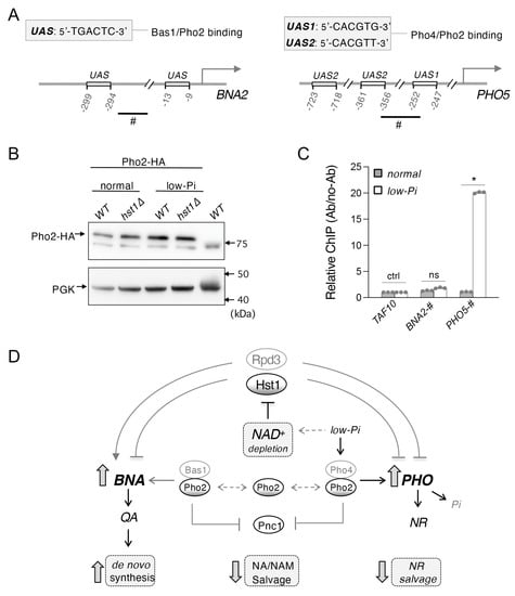 Lastly, we attempted to directly test the hypothesis that Pi depletion affects BNA expression via alteration of Bas1–Pho2 complex activity. Presumably, this would occur by increasing Pho2–Pho4 complex formation. It is possible that this increased formation of Pho2–Pho4 might reduce Bas1–Pho2 complex formation and limit the expression of the BNA genes. We again made use of the hst1Δ background in order to avoid the confounding influence of NAD+ limitation during the Pi depletion described above. To investigate this question, we focused on BNA2 as the rate-limiting element of the de novo pathway which is consistently sensitive to factors associated with the general alteration of BNA expression []. The BNA2 promoter region contains two predicted Bas1 binding sites near the transcription start site (Figure 5A, left); therefore, we assessed Pho2 binding in the short region between these sites using chromatin immunoprecipitation (ChIP) of Pho2 tagged with an HA epitope. In addition, we investigated binding to the PHO5 promoter as a positive control for PHO induction. The binding sites of Pho4 and Pho2 at the PHO5 promoter are well characterized [,,], so we measured Pho2 binding in a region previously associated with Pho4/Pho2 binding, directly upstream of the UAS1 binding site (Figure 5A, right). First, we examined the expression of the Pho2-HA protein under the conditions investigated by Western blotting. As shown in Figure 5B, Pho2-HA expression was not visibly altered relative to the PGK control either by deletion of HST1 or by depletion of Pi.