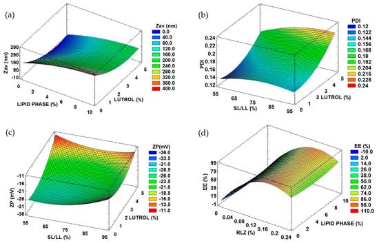 Response surface of optimized RLZ-NLCs. (a) Lutrol® F68 and lipid phase influence on Zav. (b) Lutrol® F68 and lipid phase influence on PI. (c) Solid lipid/liquid lipid [SL/LL] and Lutrol® F68 influence on ZP. (d) Lipid phase and RLZ influence on EE.