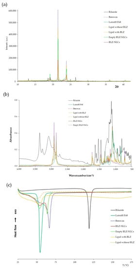 The interaction between RLZ-NLCs and their components was studied (Figure 2). First, the X-ray diffraction (XRD) profile (Figure 2a) of RLZ showed sharp peaks at different diffraction angles (13.0°, 14.0° 18.6°, 19.2°, 21.8°, 23.1°, 25.0°, 26.4°, 31.3°, and 32.0°) due to its crystalline structure [28]. These peaks were absent in the diffractograms of the RLZ-NLCs and in the drug-lipid mixture (SL and LL melt with RLZ). Instead, their diffractograms exhibited peaks attributed to beeswax, with peaks at 19.2°, 21.5°, 23.8°, 29.9°, 36.0° and 40.6°. Nonetheless, the peaks were less intense and wider compared to those of the beeswax alone. These same peaks were observed for the empty NLCs and the lipid melted without RLZ.