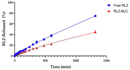 In vitro drug release of free RLZ and RLZ-NLCs in 5% Tween® 80 solution at pH 7.4.
