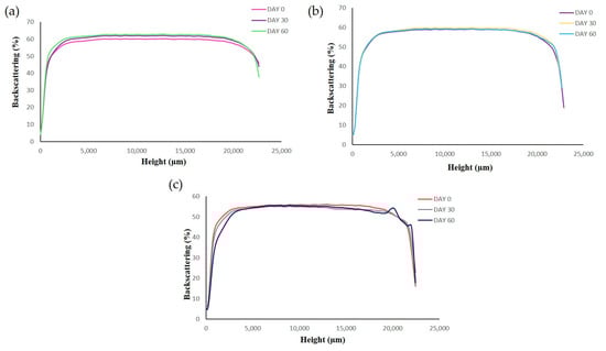 Backscattering profiles of RLZ-NLCs at different storage temperatures; (a) 4 °C, (b) 25°C and (c) 38 °C.