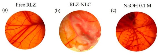 HET-CAM irritation test. (a) Free-RLZ, (b) RLZ-NLCs and (c) NaOH 0.1 M.