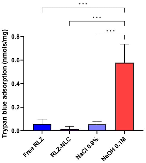 Regarding the HET-CAM test, RLZ-NLCs did not cause any irritation phenomena [56,57]. In the CAM-TBS assay, free RLZ and RLZ-NLCs trypan blue absorption results were classified as non-irritant, showing absorption values similar to the negative control. These results stay in line with previous reports about RLZ cytotoxicity [16]. Irritation response is the main adverse effect of current topical treatments; therefore, irritation probability and drug release are fundamental aspects to be improved in future management strategies [58].