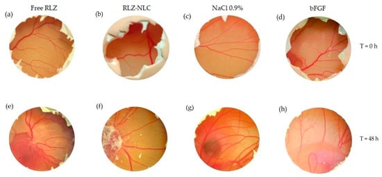 RLZ and RLZ-NLCs angiogenic capacity. Time = 0 h: (a) free RLZ, (b) RLZ-NLCs, (c) NaCl 0.9% and (d) bFGF. Time 48 h: (e) free RLZ, (f) RLZ-NLCs, (g) NaCl 0.9% and (h) bFGF.