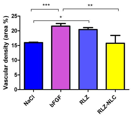 Results show that free RLZ demonstrated angiogenic capacity, since significant differences (p < 0.05) against the negative control (NaCl) were obtained, but no significance was obtained against bFGF. On the other hand, RLZ-NLCs showed significant differences (p < 0.01) against bFGF. This difference between free RLZ and RLZ-NLCs may be due to RLZ sustained release from the NLCs, which after 24 h are able to release around 40% of the drug. Therefore, NLCs with prolonged RLZ release are able to overcome RLZ angiogenic capacity.