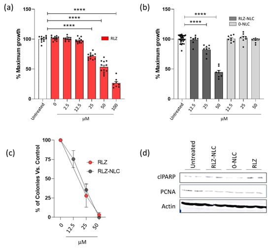 Cells were treated with RLZ or RLZ-NLCs and after 48h cells were lysed with lysis buffer containing 1% Nonidet p-40, 1% deoxycholate, 0.1% SDS, 50 mmol/L HEPES pH 7.5 and 150 mmol/L NaCl, together with protease and phosphatase inhibitors (10 μg/mL aprotinin, 10 μg/mL leupeptin, 86 μg/mL iodoacetamide, and 1 mM PMSF, 1 mM Na3VO4) [77]. Lysates were boiled in Laemmli buffer, resolved by SDS-PAGE and transferred to a PVDF membrane (Trans-Blot Turbo Transfer Packs, Biorad, Hercules, CA, USA). Membranes were blocked for 1 h at room temperature with 5% skimmed milk and incubated with anti-cleaved PARP (Cell Signaling, Danvers, MA, USA), anti-PCNA (Merck, Rahway, NJ, USA) and anti-βActin (Sigma-Aldrich, Burlington, MA, USA). Signal of secondary HRP-linked antibodies (anti-mouse IgG; Southern Biotech, Birmingham, AL, USA) was detected by enhanced chemiluminescence (ECL, Millipore, Burlington, MA, USA).