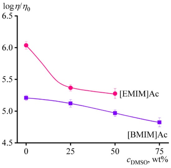 - Any low-viscosity liquids that are not solvents of cellulose nevertheless can be its nominal co-solvents at low doses, reducing the viscosity of the forming solution up to 50 times (the case of [BMIM]Ac/DMSO = 25/75) by lowering the viscosity of the used ionic liquid and deteriorating its thermodynamic affinity for cellulose macromolecules. This effect is observed for ionic liquids that are amorphous at the test temperature ([EMIM]Ac and [BMIM]Ac) but is inverse for the crystallizing ionic liquid ([EMIM]Cl), whose dilution increases the cellulose solution viscosity.