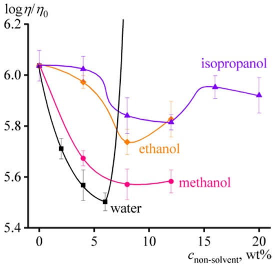 - Moderate dilution of the amorphous ionic liquid with a non-solvent causes strong (in the case of water) or weak (alcohols) structuring of the cellulose solution, manifesting as gel formation or an anomaly of low-frequency storage modulus, respectively. In the row of water, methanol, ethanol, isopropanol, and DMSO, the characteristic mass fraction of the non-solvent that causes the structuring increases, and DMSO can cause both strong and weak structuring, depending on its concentration and type of ionic liquid.