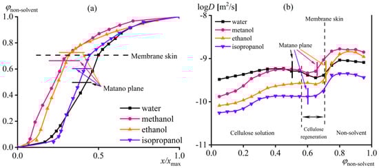 - The transition from water and methanol to ethanol and then isopropanol reduces the rate of interdiffusion of substances during the phase separation of the cellulose solution up to four times and thus slows it down. Moreover, a change in the used non-solvent can shift the mass transfer direction relative to the forming cellulose membrane, contributing to its contraction (ethanol) or swelling (water).