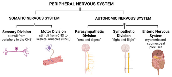 In this section, we briefly recapitulate the anatomical organization of the PNS. The PNS can be divided into the somatic nervous system (SNS) and the autonomic nervous system (ANS). Both can be further subdivided into anatomically and functionally distinct subcategories (Figure 1).