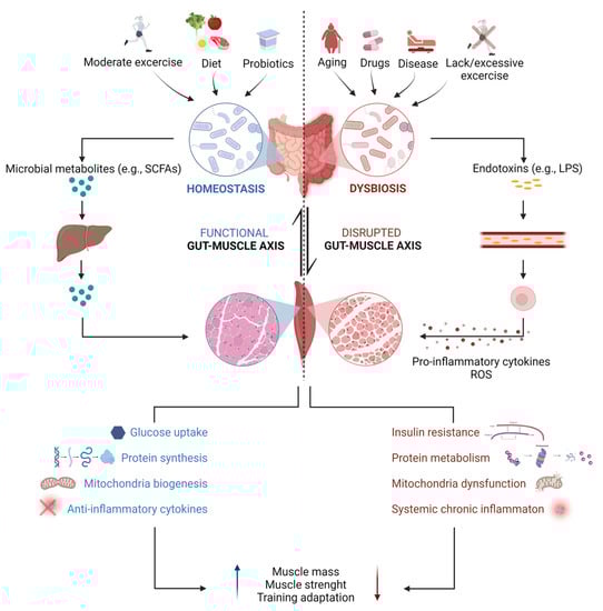 Schematic diagram of gut microbiota-mediated regulation of skeletal muscle under physiological and pathological conditions. The shaping of the gut microbiota composition is driven by both genetic and environmental factors. Regular moderate physical activity, consumption of dietary fibers and supplementation with prebiotics/probiotics promote an increase in the relative abundance of potentially beneficial bacteria, involved in the production of metabolites, among which short chain fatty acids (SCFAs). Following absorption by intestinal cells, SCFAs (mostly propionate and acetate, while butyrate is mainly used as a source of energy for colonocytes) reach the liver, where most of the propionate serves as a substrate for hepatic gluconeogenesis, while part of the acetate is destined to undergo hepatic lipid synthesis. Eventually, just small amounts of SCFAs (primarily acetate) reach the systemic circulation and directly interact with skeletal muscles [77]. Thus, both direct and indirect mechanisms concur with SCFA-mediated regulation of skeletal muscle metabolism, including modulation of glucose and energy metabolism, protein balance, mitochondrial biogenesis and regulation of inflammation, overall improving skeletal muscle mass and function. On the contrary, dysbiosis, a state that can be caused by aging, insufficient/excessive physical activity, drug consumption or disease state, is associated with increased intestinal permeability and gut leaking, which facilitates the passage of endotoxins (e.g., lipopolysaccharide, LPS) and other microbial products (e.g., indoxyl sulfate) into the peripheral circulation, from where these molecules trigger the production of pro-inflammatory cytokines and reactive oxygen species (ROS) by macrophages and promote insulin resistance, muscle proteolysis, and mitochondrial dysfunction in skeletal muscles. This results in skeletal muscle changes that may manifest as decreases in muscle mass and function, ultimately affecting muscle physical performance. Created with Biorender.com.