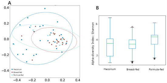 Nevertheless, α diversity measured using the Shannon index remained unchanged between groups (Figure 1B). However, when β diversity (between-sample diversity) was measured by unweighted UniFrac and compared using ANOSIM and PERMANOVA analysis, both tests showed significant segregation of the bacterial composition across different categories (Figure 1A), with the breast-fed group showing the most differentiated cluster (ANOSIM R = 0.07, p = 0.03; PERMANOVA pseudo-F = 2.11, p = 0.02).