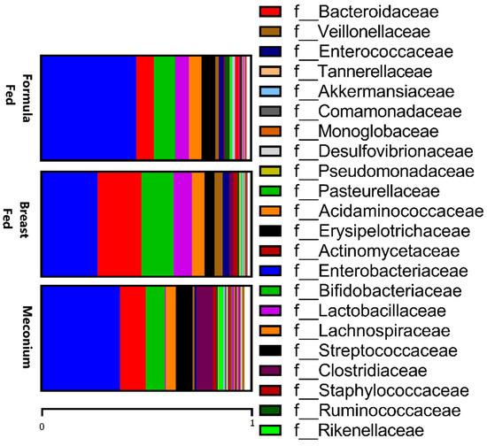 Separately, the Enterobacteriaceae family, represented by Citrobacter (p < 0.01), Enterobacter (p < 0.01), and Klebsiella (p < 0.05) genera, was less abundant in the meconium samples compared to the formula-fed group, in contrast to Akkermansia (p < 0.05) and Muribacullaceae (p < 0.05) genera, which are more abundant in the meconium samples.