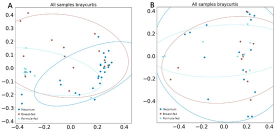 There was no difference between α-diversity (measured using the Shannon index) values among groups in either DNA viruses or RNA viruses. However, when β-diversity was measured by Bray–Curtis and compared using ANOSIM and PERMANOVA analysis, both tests showed significant segregation of the DNA viral composition across different categories (Figure 3A), with the breast-fed group showing the least differentiated cluster (ANOSIM R = 0.29, p = 0.01; PERMANOVA pseudo-F = 2.47, p = 0.01). Any difference was observed when comparing RNA viral populations (Figure 3B).
