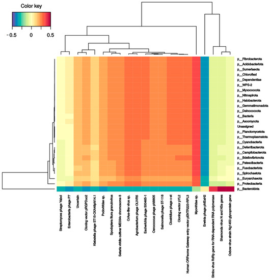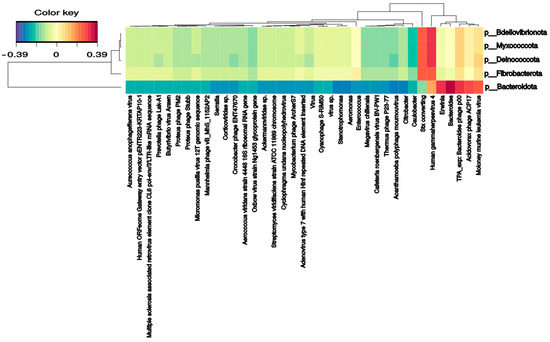 Several bacterial families correlate with phages and DNA/RNA viral species. Pseudomonadaceae and Veillonellaceae families strongly correlated with Burkholderia phage phiE094 (0.56 and 0.62, respectively). This makes sense in Pseudomonadaceae since phage phiE094 is a lytic phage mainly hosting species from the Proteobacteria phylum, but not in Veillonellaceae (Firmicutes phylum). As expected, another positive correlation was observed between a group of Bacteroidetes phages and the Bacteroidetes phylum (0.39) (Figure 4). In contrast, the Serratia (−0.27), Stenotrophomonas (−0.32), Aeromonas (−0.31), and Citrobacter (−0.30) phages were negatively correlated with the Bacteroidetes phylum. Additionally, as shown in Figure 5, the Bacteroidetes phylum was positively correlated with the Shamonda virus (0.47) and Oxbow virus (0.50), and negatively correlated with Enterobacteria phages (−0.35). Another association found was the positive correlation between Gammaherpesvirus (0.3, human virus) and the Deinococcota phylum.