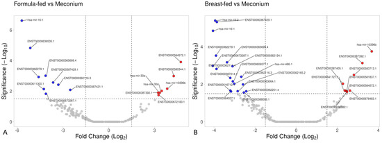 Volcano plot based on small RNA data. (A) The meconium group versus the breast-fed group, and (B) the meconium group versus the formula-fed group.