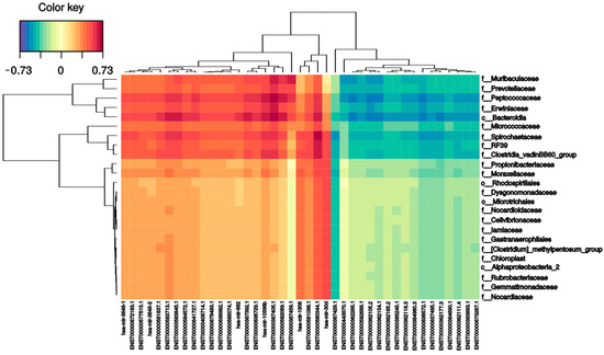 To investigate the relationships between small RNAs and the intestinal microbiome, all small RNA expression levels and microbial family abundance were analyzed together. As shown in Figure 7, the expression of several small RNAs correlated (positively and negatively) with bacterial families. For instance, there were strong positive correlations between MT-IC-201 and five bacterial families: Bacteroidia (0.73), Peptococcaceae (0.73), Spirochaetaceae (0.60), Erwiniaceae (0.62), and Muribaculaceae (0.64). mir 4792-201 had a positive correlation with five different families: Clostridiales (0.65), Clostridia (0.63), Spirochaetaceae (0.68), Bacteroidia (0.66), and Peptococcaceae (0.60). On the other hand, the Bacteroidales order had the largest number of correlations; in addition to the two previously mentioned correlations, it had six more positive correlations (one mitochondrial RNA (0.62), one SnoRNA (0.60), and four miRNAs (0.6–0.66)) and five negative correlations (mir-103b-1 (−0.58), mir-378a (−0.56), mir-101-1 (−0.56), has-let-7a-2 (−0.58), and mir-103a-2 (−0.57)). The other family that had many correlations was the Peptococcaceae family, which presented five positive (two mitochondrial RNAs (0.60) and three miRNAs (0.6–0.64)) and five negative (mir-103b-1 (−0.56), mir-378i (−0.55), mir-101-1 (−0.56), hsa-let-7a-2 (−0.58), and mir-103a-2 (−0.57)) correlations. Finally, the Muribaculaceae family had one positive correlation with mitochondrial RNA (0.63).