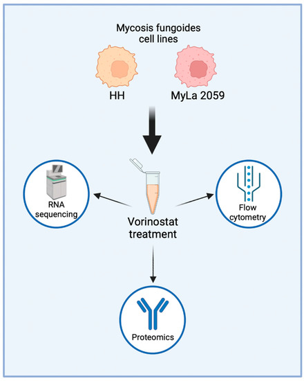 Overall study design. HH and Myla 2059 cells were used for in vitro experiments. Cells were treated with vorinostat or vehicle and subjected to RNA sequencing, reverse-phase protein array (RPPA) or proteomics, and flow cytometry.