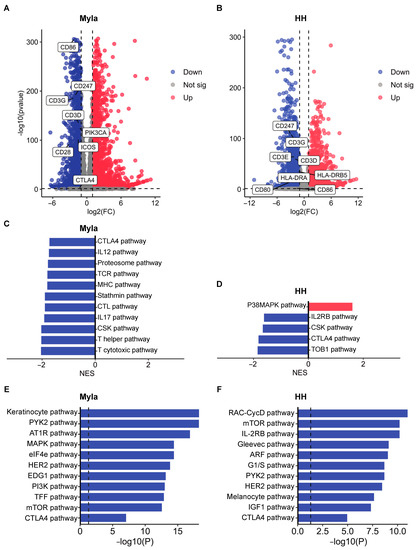 Transcriptomic and proteomics effects of vorinostat treatment. (A) Volcano plot showing DEGs between control and vorinostat-treated Myla cells. (B) Volcano plot showing DEGs between control and vorinostat-treated HH cells. Differentially expressed CTLA-4-signaling-related genes are highlighted in both volcano plots. (C) GSEA results showing pathways that are up- and downregulated by vorinostat in Myla cells. (D) GSEA results showing pathways that are up- and downregulated by vorinostat in HH cells. (E) EnrichR enrichment analysis of proteins found to be downregulated by vorinostat by RPPA in Myla cells. (F) EnrichR enrichment analysis of proteins found to be downregulated by vorinostat by RPPA in HH cells. FC—fold change; sig—significant; NES—normalized enrichment score.