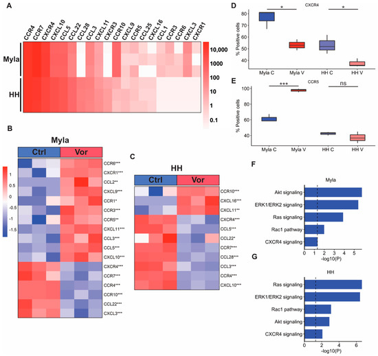 Effect of vorinostat on chemokine receptors and ligands. (A) Heatmap showing expression of chemokine receptors and ligands at baseline in Myla and HH cells. (B) Heatmap showing chemokine receptors and ligands significantly altered by vorinostat treatment in Myla cells. (C) Heatmap showing chemokine receptors and ligands significantly altered by vorinostat treatment in HH cells. (D) Boxplot showing CXCR4 expression in control and vorinostat-treated Myla and HH cells identified via flow cytometry. (E) Boxplot showing CCR5 expression in control and vorinostat-treated Myla and HH cells identified via flow cytometry. (F) EnrichR enrichment analysis of RPPA data showing downregulation of CXCR4-related pathways in Myla cells via vorinostat treatment. (G) EnrichR enrichment analysis of RPPA data showing downregulation of CXCR4-related pathways in HH cells via vorinostat treatment. * p < 0.05; ** p < 0.01; *** p < 0.001; Ctrl—control; Vor—vorinostat; C—control; V—vorinostat; NS—not significant.