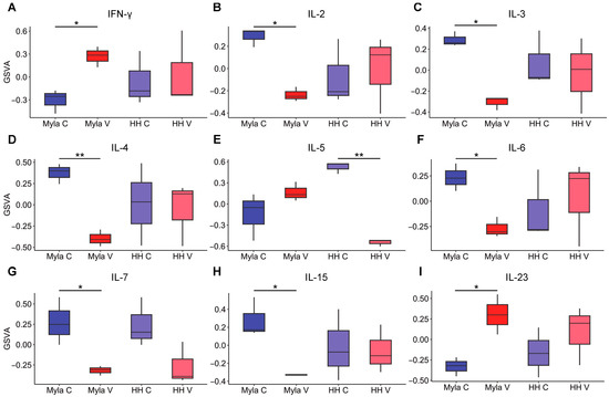 Effect of vorinostat on inflammatory pathways. (A) Boxplot showing effect of vorinostat on INF-γ signaling, (B) IL-2 signaling, (C) IL-3 signaling, (D) IL-4 signaling, (E) IL-5 signaling, (F) IL-6 signaling, (G) IL-7 signaling, (H) IL-15 signaling, (I) IL-23 signaling. * p < 0.05, ** p < 0.01; C—control; V—vorinostat; GSVA—gene set variation analysis.