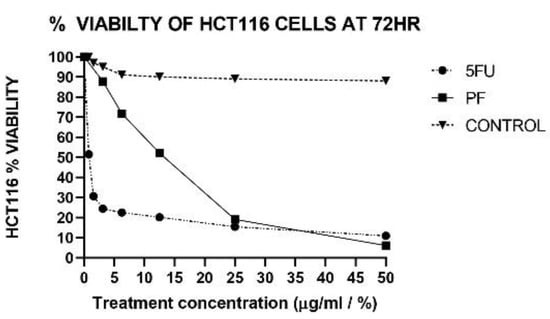 The MTT assay results showed that the cell-free supernatant of P. freudenreichii decreased the viability of HCT116 cells as the dose of the PF increased. On the other hand, 5-FU had the strongest inhibitory effect against HCT116 colorectal cancer cell proliferation compared to P. freudenreichii (Figure 1). The IC50 of 5-FU against HCT116 cells after 72 h of treatment was 0.84 ± 0.02 µg/mL, while the IC50 of P. freudenreichii was 13.3 ± 0.133% at the same time point.