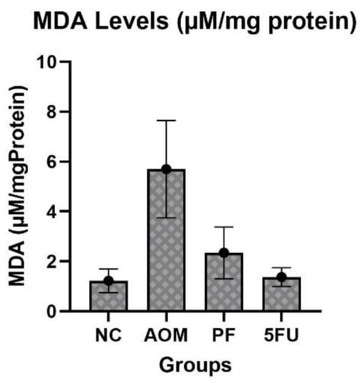 Malondialdehyde (MDA) concentrations in the rat’s colon samples of the AOM-induced group increased remarkably to 5.7 ± 1.9 µM/mg protein compared to the normal control (NC) group, indicating oxidative stress. On the other hand, P. freudenreichii probiotic supplementation reduced oxidative stress to 2.34 ± 0.87 µM/mg protein in treated rats. MDA levels were also reduced in rats given 5-FU (Figure 2).