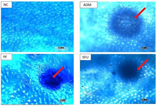 The harvested colon tissues from all animals were fixed in buffered formalin (10%) and histologically processed and embedded in paraffin wax. Eosin and hematoxylin were used to stain the colon sections. Under a light microscope, every ACF found in the colon of the treated groups was examined for its characteristics and compared to a normal untreated control [].