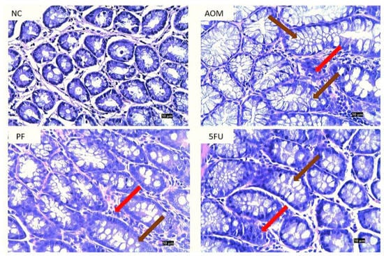 Histological analysis of the colons of treated and untreated rats. (NC): normal control, (PF): P. freudenreichii, (AOM): azoxymethane, and (5-FU): 5-Fluorouracil, (scale bar = 50 µm). The brown arrows indicate the enlarged crypts, and the red arrows show the infiltration of inflammatory cells.