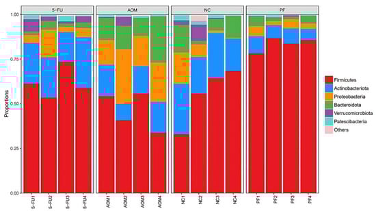 Plot of the gut microbiota diversity at Phylum level. (NC): normal control group, (PF): P. freudenreichii group, (AOM): azoxymethane control group, and (5FU): 5-fluorouracil reference group.