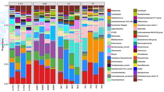 Plot of the gut microbiota diversity at genus level. (NC): normal control group, (PF): P. freudenreichii group, (AOM): azoxymethane control group, and (5FU): 5-fluorouracil reference group.