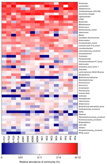 Heatmap analysis of microbial composition at genus level. (NC): normal control group, (PF): P. freudenreichii group, (AOM): azoxymethane control group, and (5FU): 5-fluorouracil reference group.