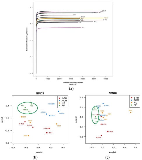 (a) Alpha diversity analysis using the Shannon index shown as sequences per sample. The x-axis shows the number of reads per sample, while the y-axis indicates the Shannon index. Each curve represents a different sample and is illustrated in a different color. (b,c): beta diversity analysis visualized with non-metric multidimensional scattering plot (NMDS), (NC): normal control group, (PF): P. freudenreichii group, (AOM): azoxymethane control group, and (5FU): 5-fluorouracil reference group.