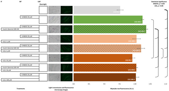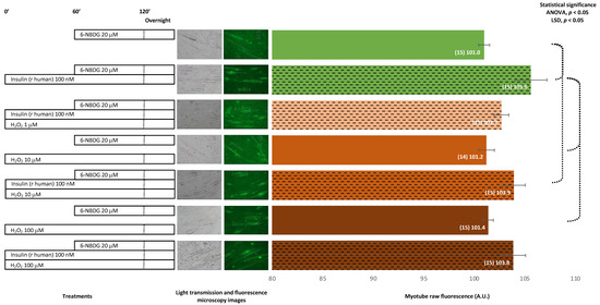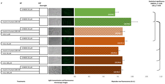Figure 3. 6-NBDG uptake in C2C12 myotubes under different treatments. 6-NBDG incubation for 19 h. Treatments exposure was 20 h: insulin, hydrogen peroxide, insulin, and hydrogen peroxide. Data from individual myotubes cultured in three independent wells are presented as the means of raw 6-NBDG intracellular fluorescence, number of myotubes (n), and SEM. Statistical analysis: one-way ANOVA, followed by the LSD post-hoc test for paired comparisons. Statistical significance was set to p < 0.05: ANOVA and LSD post-hoc (dashed connectors). Light transmission and fluorescence emission microscopy images show individual C2C12 myotubes representative of every experimental condition.