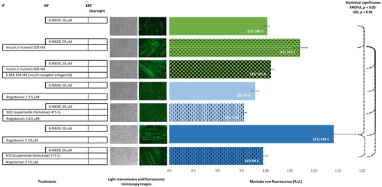 Figure 4. 6-NBDG uptake in C2C12 myotubes under different treatments. 6-NBDG incubation for 19 h. Treatments exposure was 20 h: insulin, insulin receptor blocker (S-961) and insulin, angiotensin II, and superoxide dismutase and angiotensin II. Data from individual myotubes cultured in three independent wells are presented as the means of raw 6-NBDG intracellular fluorescence, number of myotubes (n), and SEM. Statistical analysis: one-way ANOVA, followed by the LSD post-hoc test for paired comparisons. Statistical significance was set to p < 0.05: ANOVA and LSD post-hoc (dashed connectors). Light transmission and fluorescence emission microscopy images show individual C2C12 myotubes representative of every experimental condition.