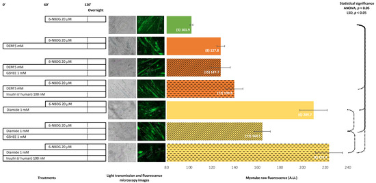 Figure 5. 6-NBDG uptake in C2C12 myotubes under different treatments. 6-NBDG incubation for 19 h. Treatments exposure was 20 h: DEM, DEM and GSHEE, DEM and insulin, diamide, diamide and GSHEE, and diamide and insulin. Data from individual myotubes cultured in three independent wells are presented as the means of raw 6-NBDG intracellular fluorescence, number of myotubes (n), and SEM. Statistical analysis: one-way ANOVA, followed by the LSD post-hoc test for paired comparisons. Statistical significance was set to p < 0.05: ANOVA and LSD post-hoc (dashed connectors). Light transmission and fluorescence emission microscopy images show individual C2C12 myotubes representative of every experimental condition.