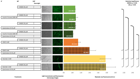 Figure 6. 6-NBDG uptake in C2C12 myotubes under different treatments. 6-NBDG incubation for 19 h. Treatments exposure was 20 h: insulin, cytochalasin B, cytochalasin B and insulin, DEM, DEM and cytochalasin B, diamide, and diamide and cytochalasin B. Data from individual myotubes cultured in three independent wells are presented as the means of raw 6-NBDG intracellular fluorescence, number of myotubes (n), and SEM. Statistical analysis: one-way ANOVA, followed by the LSD post-hoc test for paired comparisons. Statistical significance was set to p < 0.05: ANOVA and LSD post-hoc (dashed connectors). Light transmission and fluorescence emission microscopy images show individual C2C12 myotubes representative of every experimental condition.