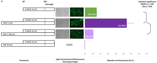 Figure 7. 6-NBDG uptake in C2C12 myotubes under different treatments. 6-NBDG incubation for 19 h. Treatments exposure was 20 h: SNAP, NOC-7, and SNP. Data from individual myotubes cultured in three independent wells are presented as the means of raw 6-NBDG intracellular fluorescence, number of myotubes (n), and SEM. Statistical analysis: one-way ANOVA, followed by the LSD post-hoc test for paired comparisons. Statistical significance was set to p < 0.05: ANOVA and LSD post-hoc (dashed connectors). Light transmission and fluorescence emission microscopy images show individual C2C12 myotubes representative of every experimental condition.