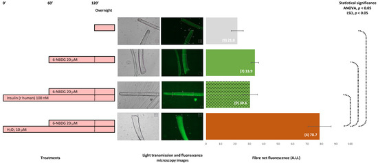 The first set of experiments was performed with fibres isolated from 9–10-month-old mice (Figure 8). Fibres that were incubated without 6-NBDG, i.e., the negative control, emitted autofluorescence. As in myotubes, this autofluorescence is intrinsic and produced by intracellular components with fluorescence properties. Fibres incubated with 6-NBDG, i.e., the positive control, presented values of fluorescence higher than those of the negative control, with no statistical difference compared to the fibres treated with insulin. It is well known that insulin is the main factor that facilitates glucose uptake under physiological conditions [6], and we expected an increase in 6-NBDG. However, we observed no change in 6-NBDG fluorescence in fibres treated with insulin. Thus, we speculated that there might be an impairment in the induced-insulin PI3K/Akt pathway that regulates glucose uptake or a blockade in insulin binding to its receptor. Somehow, these fibres appeared to show insulin resistance. However, the fibres were isolated from young-adult mice 9–10 months old; thus, insulin resistance due to ageing is unlikely. Other reasons could include external experimental factors out of our control (pH, temperature, and CO2) that affect glucose uptake. The fibres treated with the ROS hydrogen peroxide yielded a significant increase in 6-NBDG, which confirmed that hydrogen peroxide and a moderate oxidative state facilitated glucose uptake in skeletal muscle fibres, although these fibres might be insulin resistant. This result reinforces the hypothesis that oxidative eustress produced by hydrogen peroxide [57] facilitates glucose uptake in skeletal muscle [58]. This is our hypothesis, which we believe will yield functional and pharmacological therapeutic approaches in the future if this research continues.