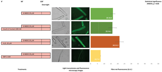 Figure 10. 6-NBDG uptake in skeletal muscle fibres isolated from 25–29-month-old male mice. Fibres in the culture were subjected to different treatments. 6-NBDG incubation for 19 h. Treatments exposure was 20 h: Insulin, hydrogen peroxide, and SNP. Data from individual fibres cultured in independent plates are presented as the means of net 6-NBDG intracellular fluorescence, number of fibres (n), and SEM. Statistical analysis: one-way ANOVA. No statistical significance was observed based on ANOVA (p > 0.05); thus, the post-hoc test for paired comparisons was un-applicable. Light transmission and fluorescence emission microscopy images show individual fibres representative of every experimental condition.