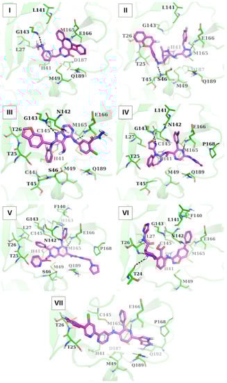 Structural complexes of compounds I–VII with SARS-CoV-2 Mpro generated by molecular docking. The enzyme residues forming intermolecular contacts with the ligands are indicated. Hydrogen bonds are shown by dashed lines.