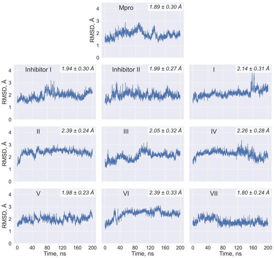 The time dependence of the RMSD (Å) calculated between all of the MD structures and the starting models of the identified and control compounds bound to SARS-CoV-2 Mpro. The corresponding data are also shown for the enzyme in the unbound state. In the upper right corner, the mean values of RMSD and corresponding standard deviations for the last 150 ns of the MD trajectories are indicated.