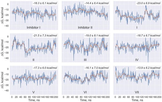 Time dependences of binding free energies for complexes of the identified and control compounds with SARS-CoV-2 Mpro. The orange line shows a simple moving average with a window size of 20 ns. In the upper right corner, the mean values of binding free energies and corresponding standard deviations calculated for the last 150 ns of the MD trajectories are indicated.