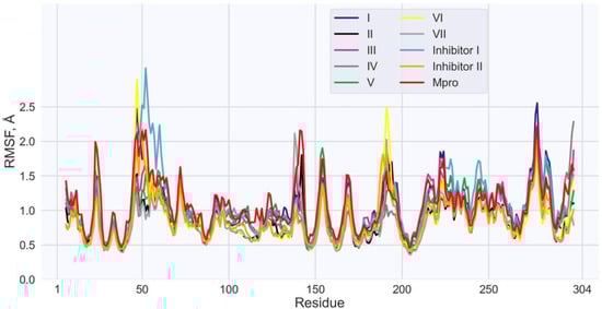 Values of RMSF (Å) for each residue along the Mpro amino acid sequence. The following designations are used: purple, black, pink, grey, green, yellow, and light grey lines correspond to Mpro in the complexes with compounds I, II, III, IV, V, VI, VII, respectively; blue and orange lines match Mpro bound to the control inhibitors I and II, respectively; red line satisfies Mpro in the unbound state.